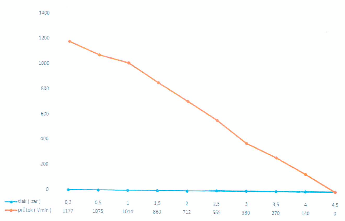- Průtok při 0,5 bar: 1255 l/min, bar: 1093 l/min, 3 bar: 551 l/min