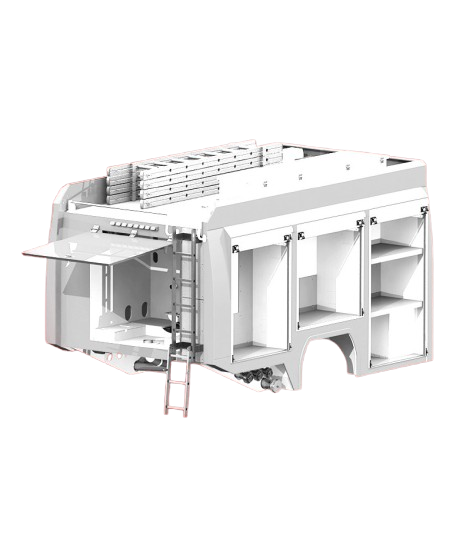 Na základě detailního 3D návrhu pro vás navrhneme a vyrobíme polymodulovou nástavbu přesně podle vašich potřeb. Můžete zvolit surové provedení bez laku nebo kompletní lakovanou variantu včetně doplnění o další prvky, jako jsou roletové systémy a příslušenství.